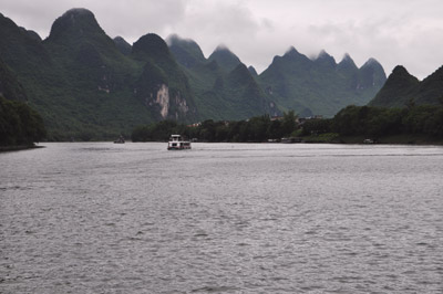 今回の旅の目的「漓江(りこう)の川下り! 小雨が降ってるが、今は雨期で毎日 朝と夕方に雨が降るのは当たり前で、この雨が霧を生み桂林の最も桂林らしい景色を生み出しているのです。 |