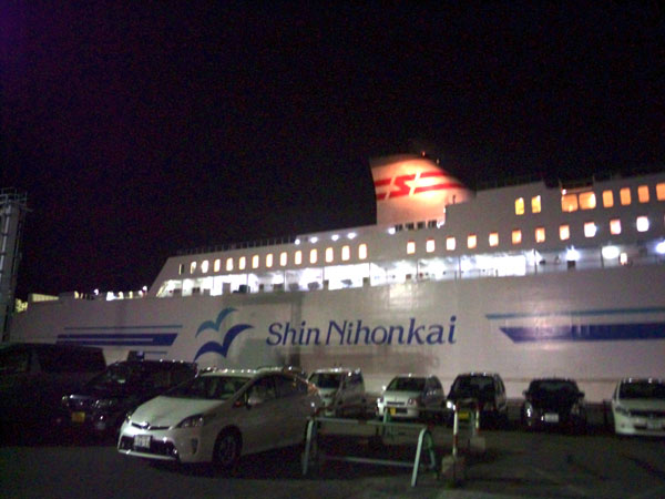 写真の船は新潟経由の8時に出る船で、シゲ爺の乗る船は、この船が出た後、入港し、乗ってる車を全部降ろし、トレーラーを載せ、無人のトラックを乗せやっとシゲ爺達が乗り、あたふたと出港と言うはこびです(笑)