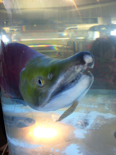 千歳川周辺の3つの川で、ベニサケの試験放流中で、帰ってきたサケを捕獲してここに展示してた。
